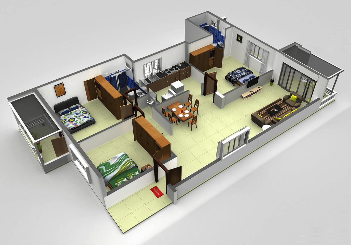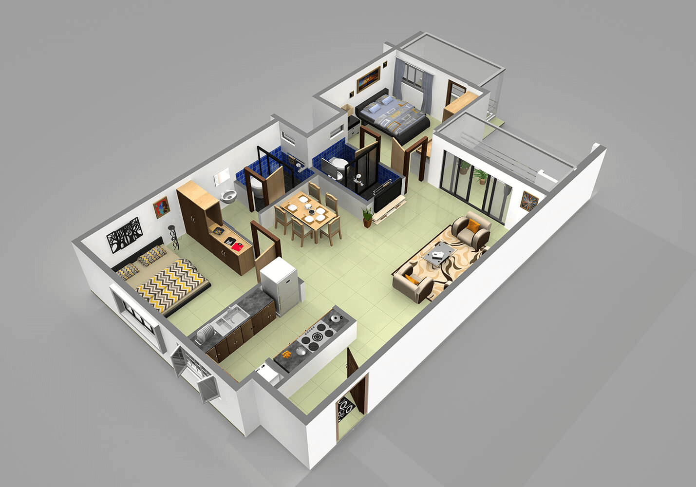 Vitrified tiles in Living room, Dining room, Bed Room and Kitchen. Anti-skid ceramic flooring for Bathrooms and balcony. Granite flooring for Lobby, staircases and corridor. - Kitchen